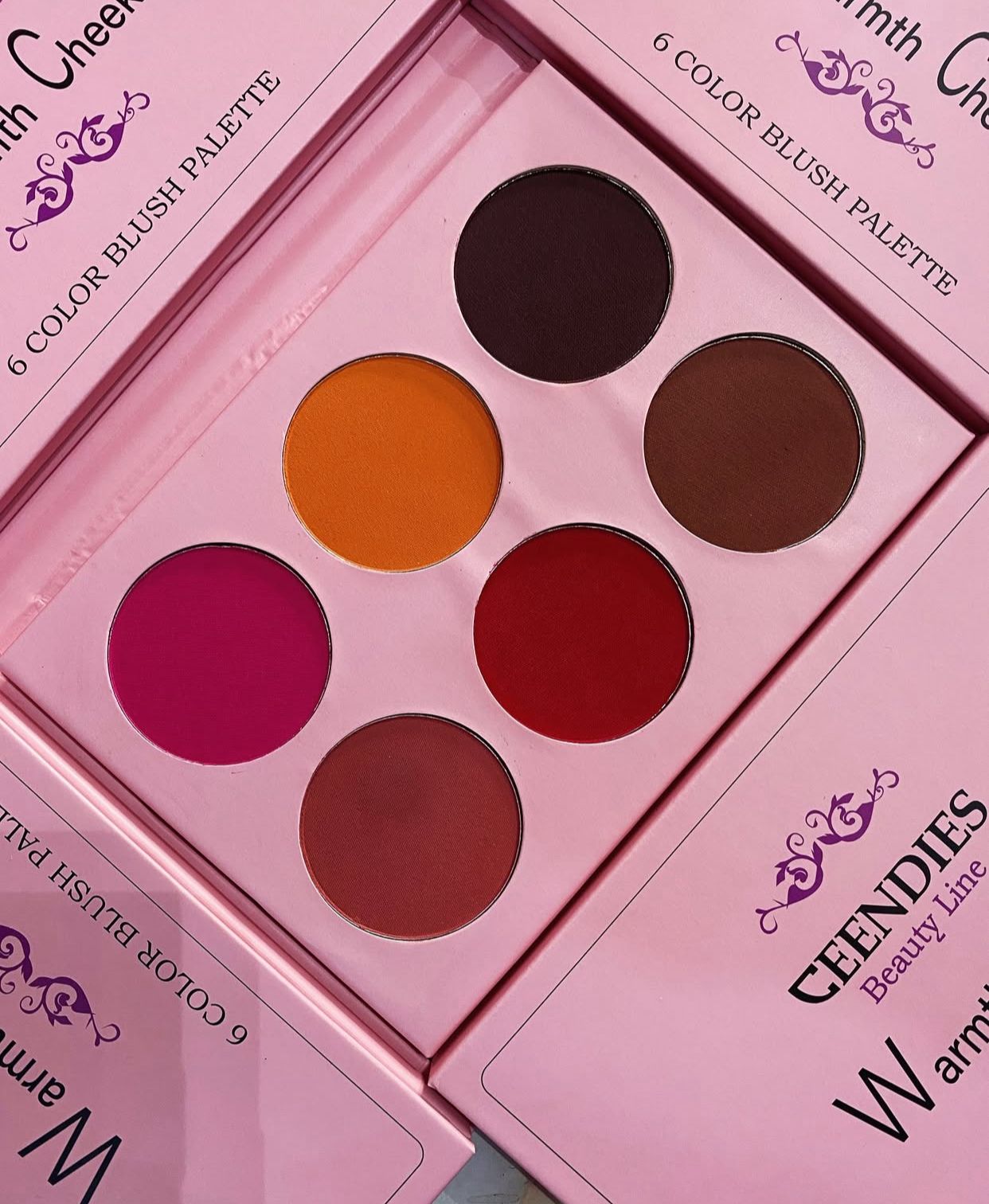 The Ceendies Warmth Cheeks Blush Palette is a makeup product that contains six versatile, blendable shades for adding a flush of color to the cheeks. It's designed to be easy to apply and creates a natural or sculpted look. The palette is available in both matte and satin finishes. Ceendies Beauty Line Warmth Cheeks is also described as being super pigmented and suitable for both personal and professional use